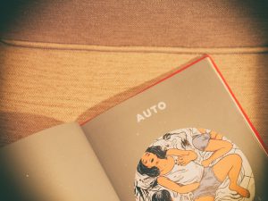 Ciekawa byłam drugiej opowieści rysowanej subtelniejszą kreską w barwach różu, niebieskiego i bieli ręką Agaty Nowickiej o tytule „Auto”. Autoerotyka, która możliwie bywa jeszcze jakimś obszarem wstydliwości dla niektórych, mogłaby przełamać tę zbędne uczucie w wahających się jeszcze kobietach. Bohaterka dostaje w prezencie wibrator od swojego kolegi geja, co już trąci zwietrzałym stereotypem. Gdy tutaj dla odmiany pojawiają się dialogi, człowiek nie wierzy w to jak brzmią, ma je chęć wręcz odzobaczyć. Otrzymując wibrator usłyszymy:
